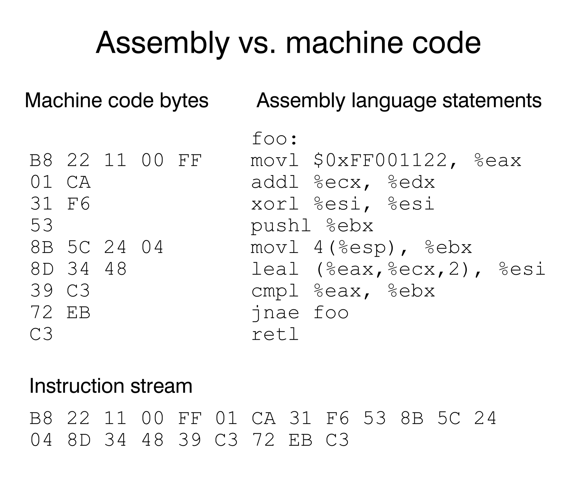 Starting from the very bottom, we have the machine code. As most people know, it’s just a set of 0s and 1s arranged in a specific way so that their different groups are meaningful to the machine. Some might indicate a particular instruction, others - data, and all that stuff…