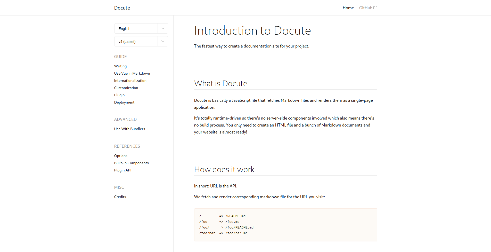 Docute is a similar tool to Docsify with a cute name. The newest version (v4) feels a bit less documented than the previous one but it also simplifies things a little bit. Generated docs look minimalistic, simple and elegant. The theme can be customized using CSS variables. Docute doesn’t have so robust plugin system as Docsify, but it has its own advantages. It’s built on Vue.js, which result in slightly bigger bundle size than that of Docsify but also allows for a lot of extendability. For example, in your MD files, you can use some of the built-in Vue components or even your own ones.