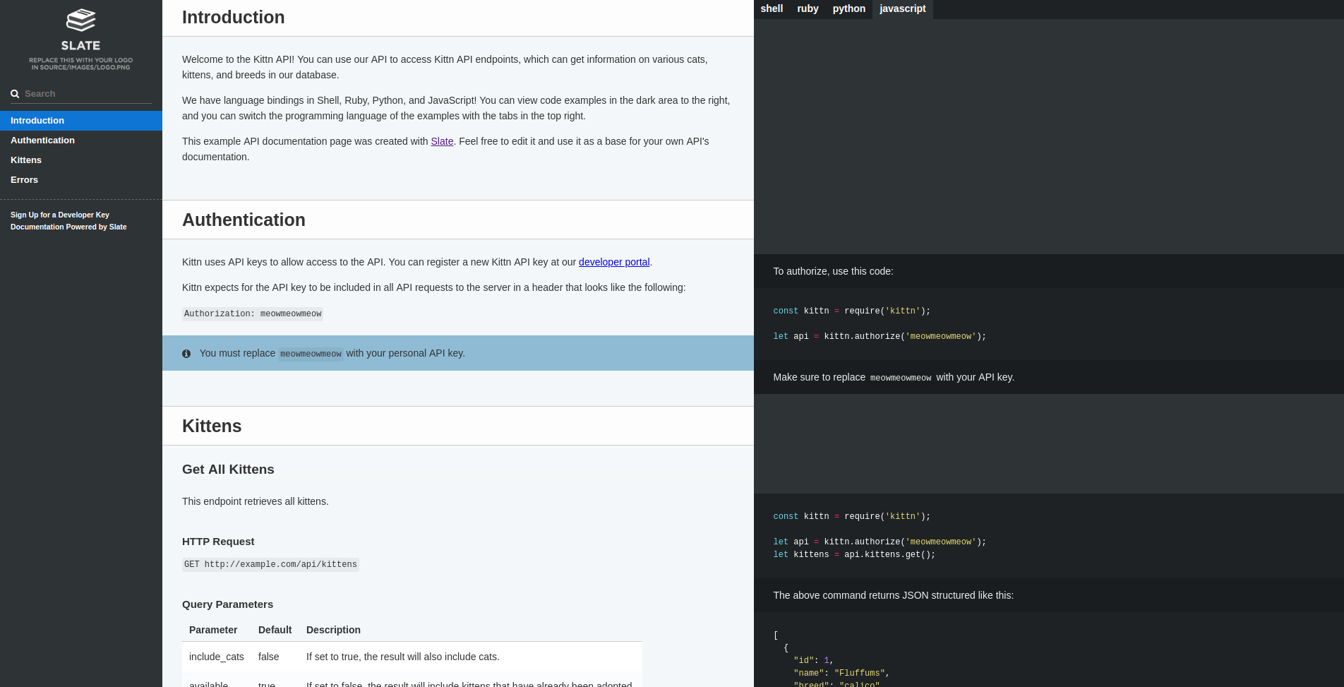 Slate is probably the leader when it comes to documenting your projects and its stars on GitHub (~25,000). Its docs feature clean and readable syntax with the everything-on-one-page feature. It comes with pretty solid GH wiki documentation. It allows for vast theming but you’ll have to do digging yourself as the documentation doesn’t provide much info. Sadly, it isn’t much extendable, but quite feature-packed. It seems like especially good option for those who need nice docs for REST API. Keep in mind that Slate generates static HTML files instead of doing this at runtime.