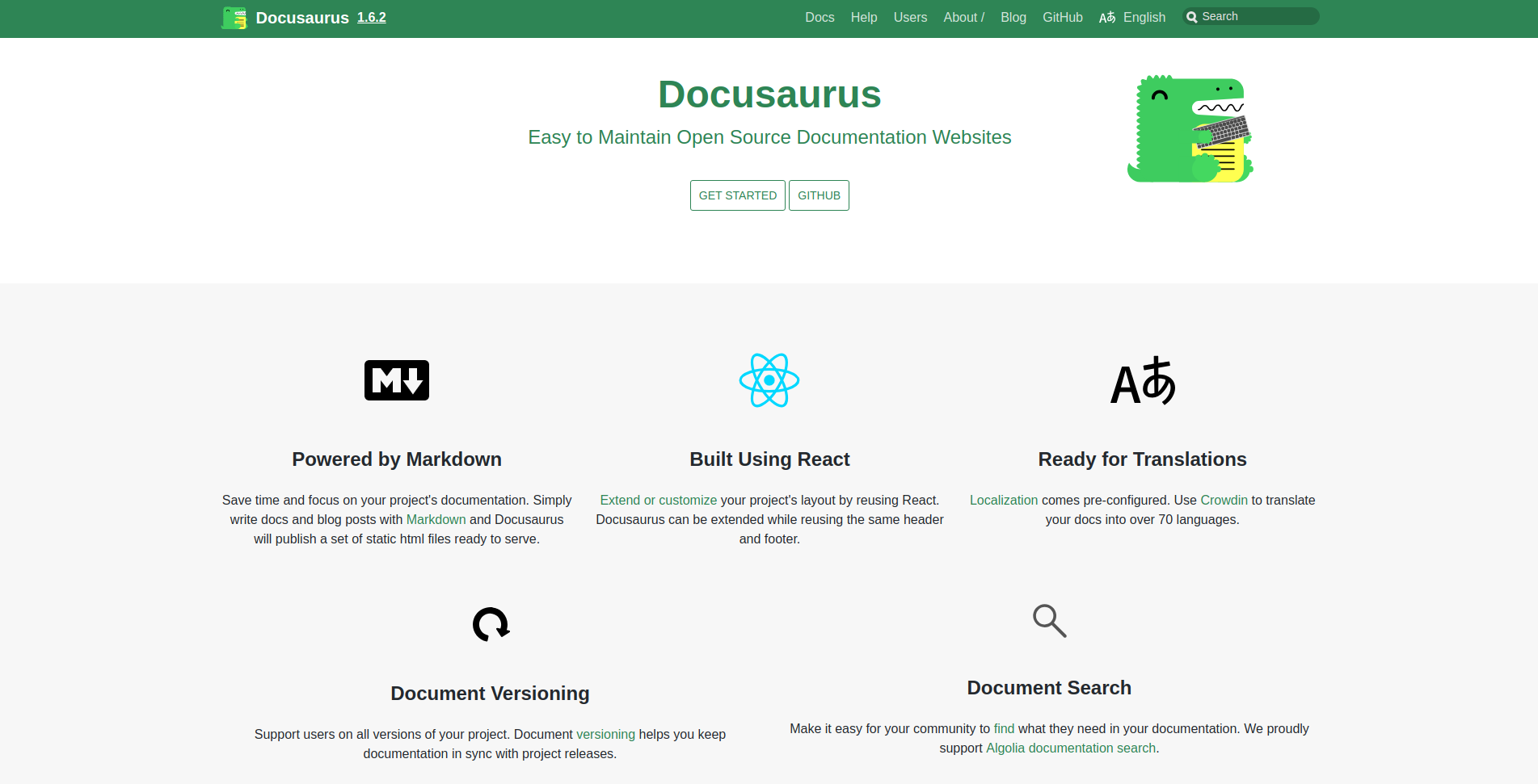 Docusaurus is a tool for easy to maintain open source documentation websites. It’s built by Facebook using - you guessed it - React. It allows for easy translation and integration with React component and library as a whole for creating custom pages. It also features an ability to set up additional blog straightly integrated with your docs website or even only by itself! It can be well-integrated with Algolia DocSearch for making your docs easy to navigate. Just like Slate, it generates static HTML files.