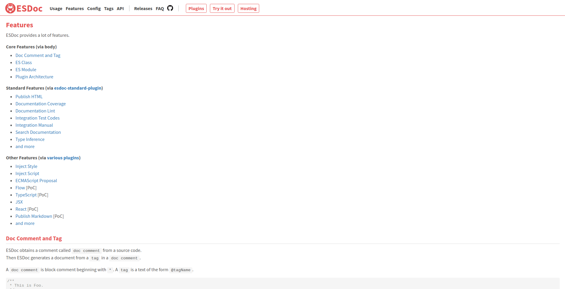 ESDoc is similar in its functionality to JSDoc. It supports a set of tags similar to the one of JSDoc. It has optional support for documentation linting and coverage. It has really vast plugin collection. Also, there are some proof-of-concept plugins for likes of TypeScript, Flow and markdown output.