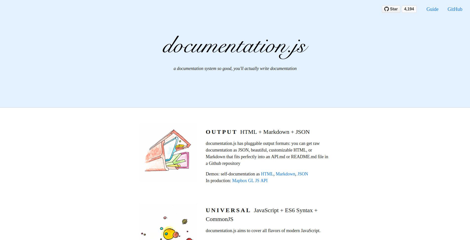 Documentation.js is modern documentation generator, which can output HTML, JSON or markdown for great flexibility. It has support for features like ES2017, JSX, Vue templates, and Flow types. It is also capable of type inference and naturally - JSDoc tags. It has deep theming options based on underscore templates. Sadly, (for me) it doesn’t support TypeScript. 😕