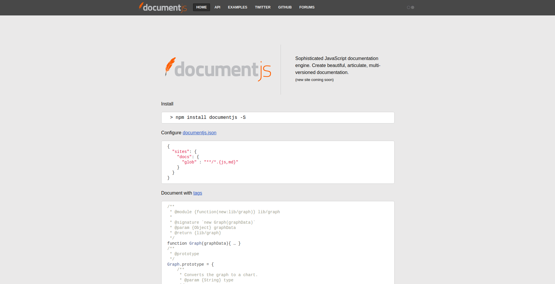 DocumentJS is a bit less popular than its competitors above, solution for documentation generation. It supports most of JSDoc and Google Closure Compiler tags with the additional functionality of adding yours. By default, it can only generate themeable HTML but it has vast extending capabilities.