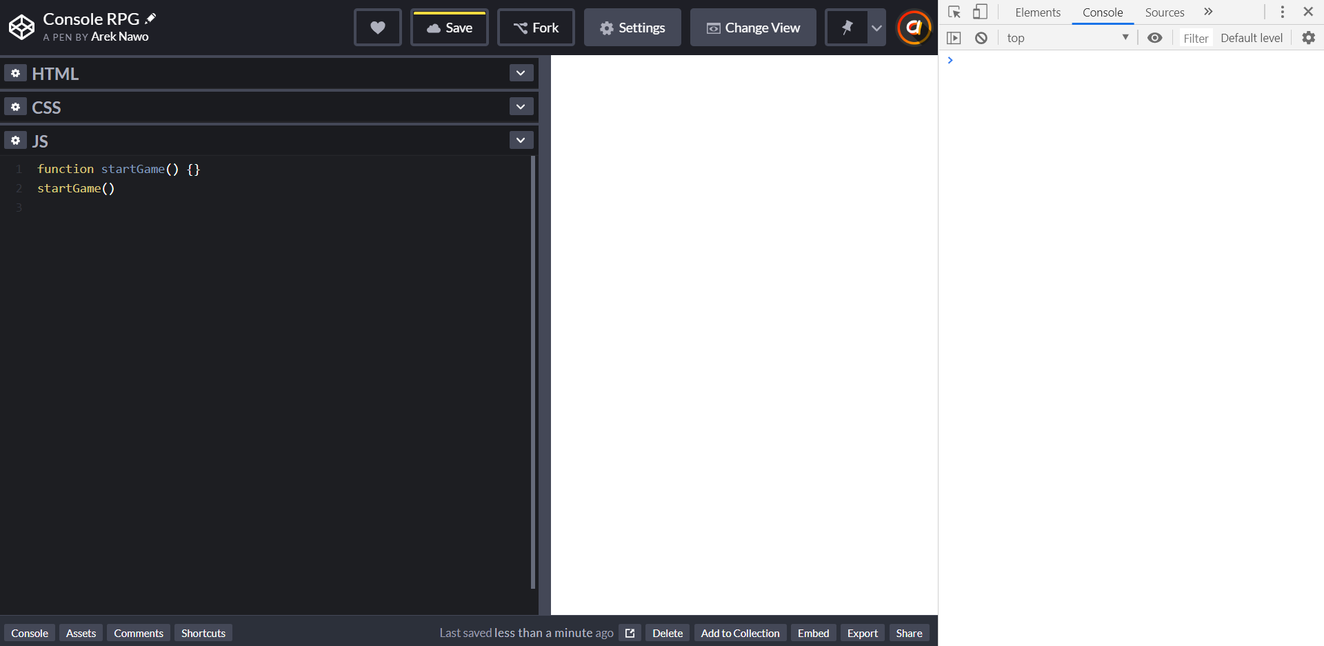 So, let’s go to codepen.io - a simple, online code editor (but you can use anything else you want) - and open the browser’s console (usually with F12 key), as these are the places that we’re interested in. First, create a startGame function and call it immediately after. Inside of it, we’ll make all the needed preparations to set up our game.