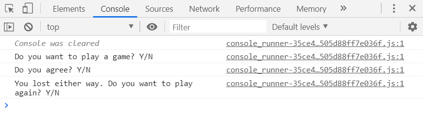 Just a quick note on the end step. As you can see, we handle the no answer to this step with a custom function that calls [console.clear](https://developer.mozilla.org/en-US/docs/Web/API/Console/clear) method. As the player said that he no longer wants to play, with this Console API call, we clear the console of all the previous messages, thus ending the game.