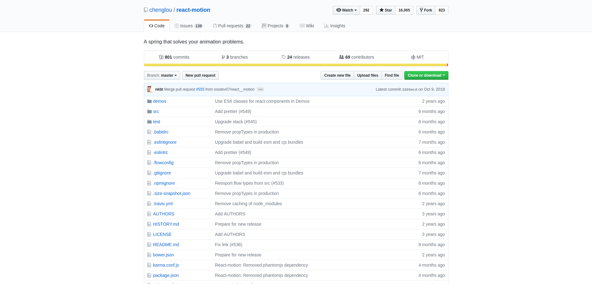 Inspired by React-motion, React-spring provides a very much similar approach to animation design. Its design is based on spring-physics (that’s where the name comes from) and attempts to solve one of React-motion’s drawbacks - performance. So, with that said, being a young project, React-spring provides great and easy-to-use declarative API that delivers great performance and high-quality overall. That’s why its community has grown so fast! 😲 I can personally say that this project truly impressed me! Also, if you like React’s new hooks, React-spring provides something special for you too! 😉 Naturally, docs are awesome and insightful. I can say that this project is definitely worth at least a try!