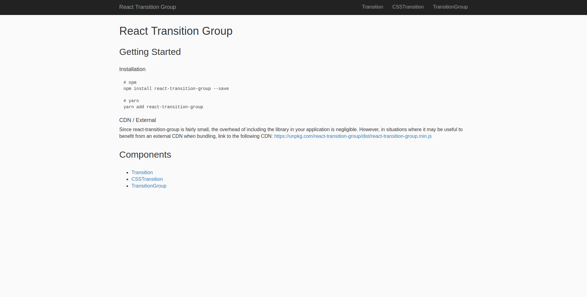 React-transition-group is an official React community plugin for creating animations. It’s extremely small and provides low-level API for controlling and animating your component’s state. It also has support for CSS transitions built-in. Documentation provides enough info on all accessible functionalities. As this is a fairly low-level project, if you want to do some animations fast and easy, this might not be for you. But, keep in mind that many React animation libraries are based on or inspired by this particular tool. That’s why it might be worth knowing, just to know how certain things work under-the-hood. 👍
