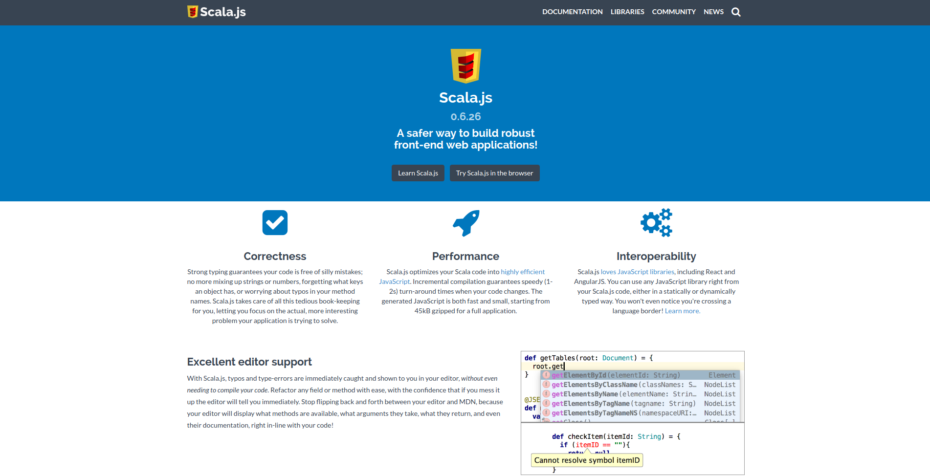 Scala.js allows you to compile Scala programming language to JavaScript. With it, you can write a modern, post-ES6-like code with a strong type system. This means great IDE support and features like classes, modules, types, and macros for extending the language out-of-the-box! Scala.js claims to have near-native JS performance and support for standard JS libraries through facades types system. If you’ve already programmed in Scala, this might be something for you. Also, project page provides a great guide for those coming from ES6 background. Let’s sum up some basic differences.