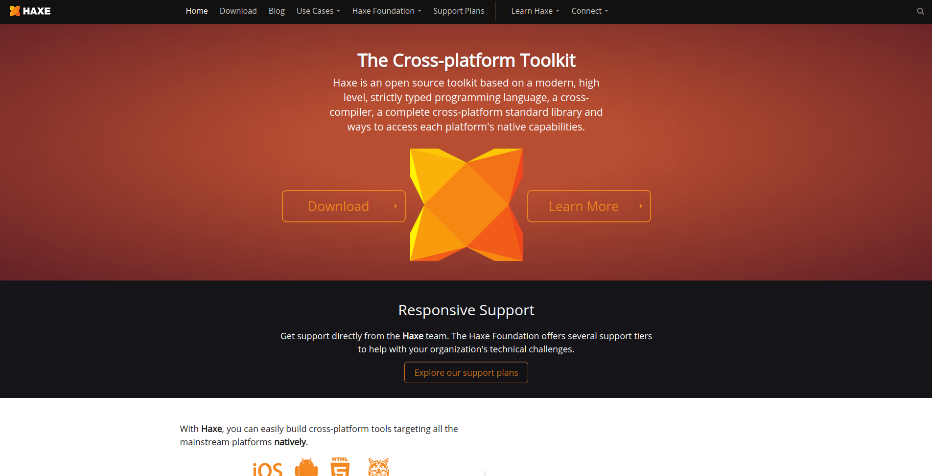 Haxe is a truly cross-platform solution for dynamic and interactive apps development. It can be compiled to a number of other languages, including JS. Because of that, Haxe has a number of use-cases - games, server backends, websites, professional software, and counting. The website provides great documentation with an impressive amount of details. As for the language itself, it has nice object-oriented and type-safe syntax (great IDE support) with various other features like metadata and compiler’s macros. This time, a proper “Hello World!” can be used. 😁