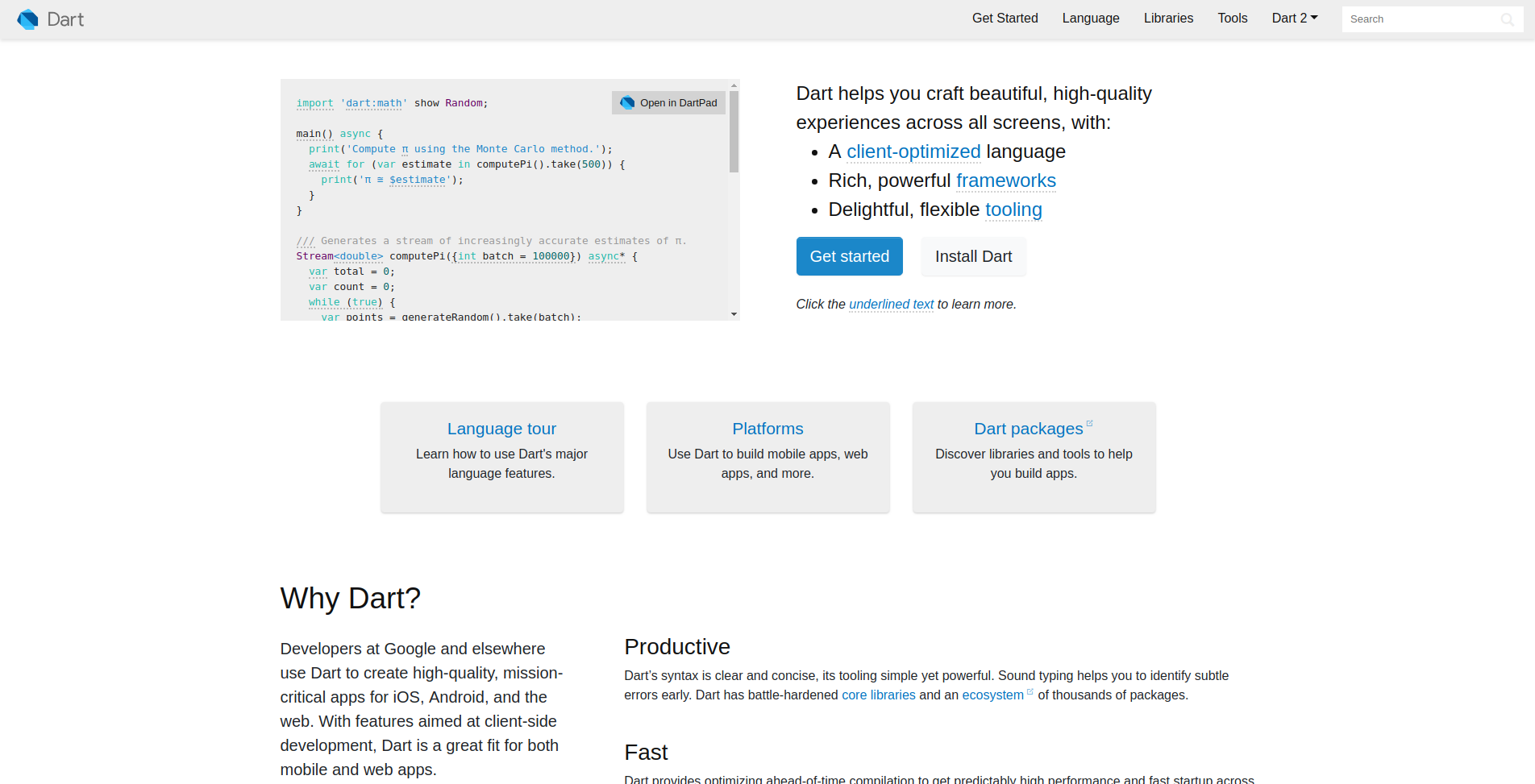 Dart has gained quite a boost in popularity lately, due to the Flutter framework. Flutter can be used to develop Android and iOS application with ease. And it’s actually written using Dart! On to the Dart then. It’s a VM-based language created by Google, so it can run on its VM as server backend, on the web when JS-compiled and on other x86 and ARM platforms (especially for mobile with Flutter). Its syntax is inspired by C, C#, and Java with the vast standard library. The example below is taken from DartPad (Dart online playground) Fibonacci example: