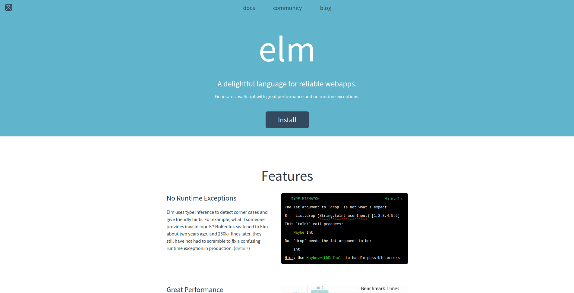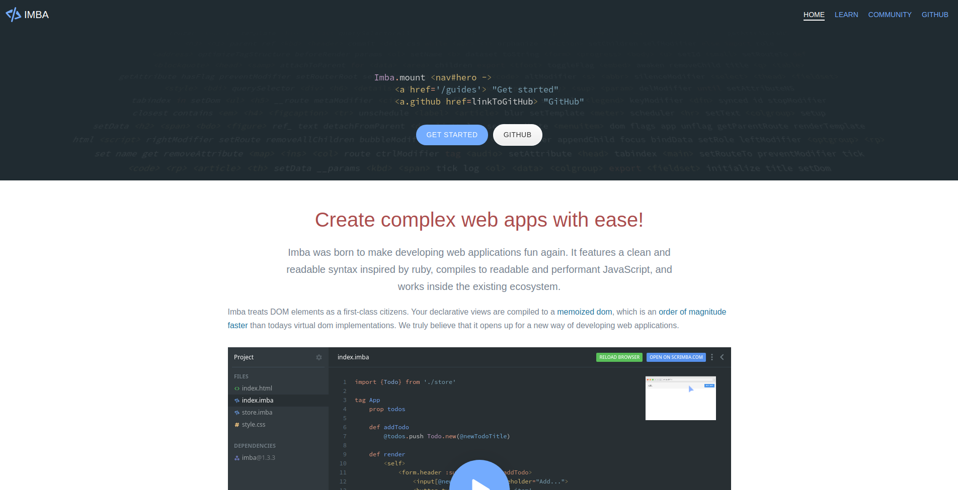 Imba is yet another web-apps-development-focused language. I think of it as a younger Elm competitor. With its memoized DOM, Imba claims to be faster than all of today’s virtual DOM implementations.
