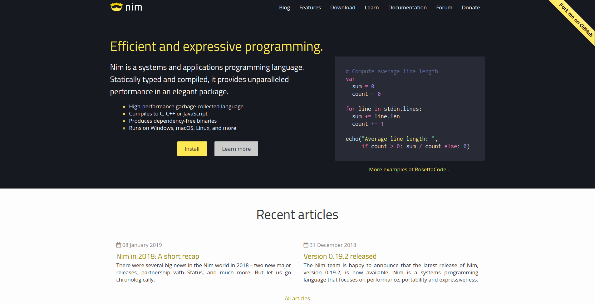 Returning to more standard programming languages, we’re greeted with Nim. Nim is statically-typed, garbage-collected language that can be compiled to C, C++, and JS. It has indentation-based syntax inspired by Python and great support for meta-programming and macros. Generally, it all comes down to great performance, interesting syntax, and editor support.