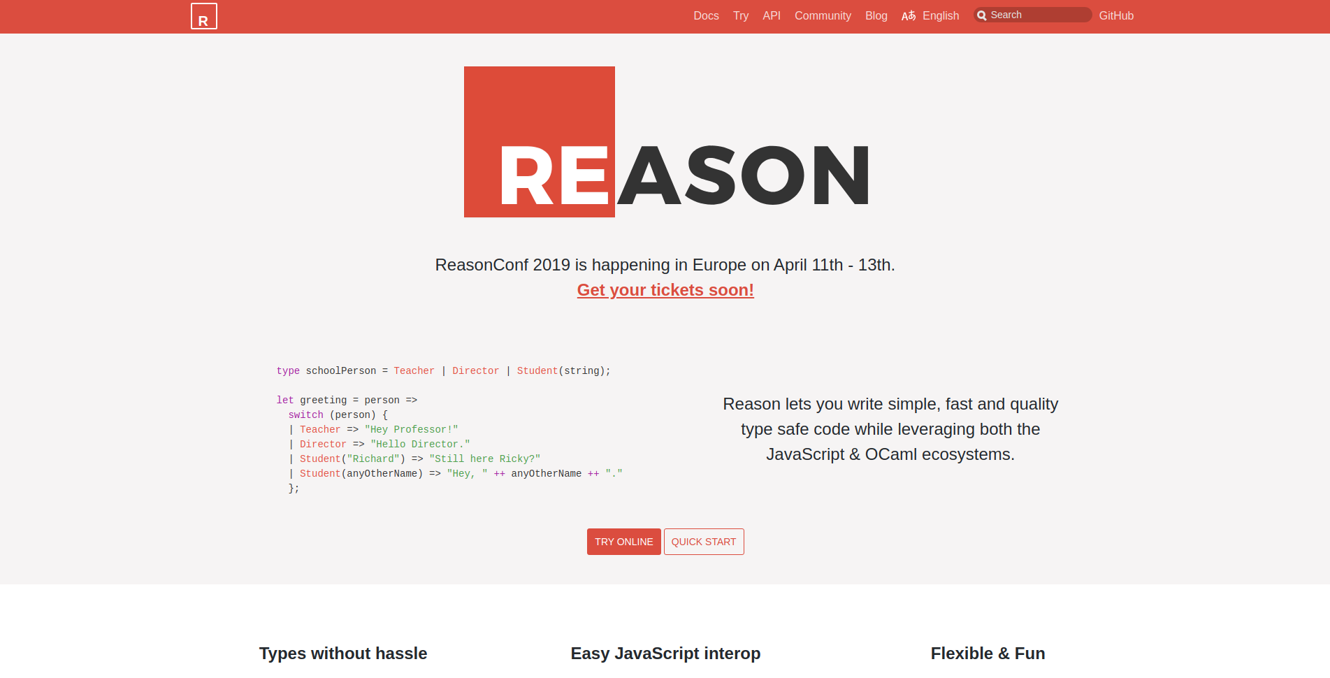 Opening the best three, we have Reason. Reason is a language developed by Facebook, focused on type-safety and interoperability. It’s based on JS and OCaml ecosystems. As Reason is coming from the guys behind React, it has really good support across the board. The type system is nice and general development experience just rocks. ✌Also, Reason has been well-designed to feel familiar with JS developers while preserving OCaml best features, including the type system.